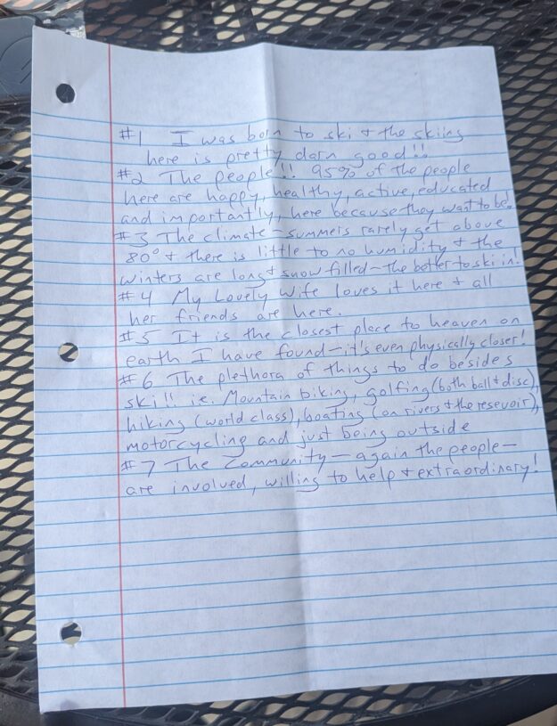 #6 The plethora of things to do besides ski!! i.e. Mountain Biking, golfing (both ball and disk), hiking (world class), boating (on rivers & the reservoirs), motorcycling and just being outside.