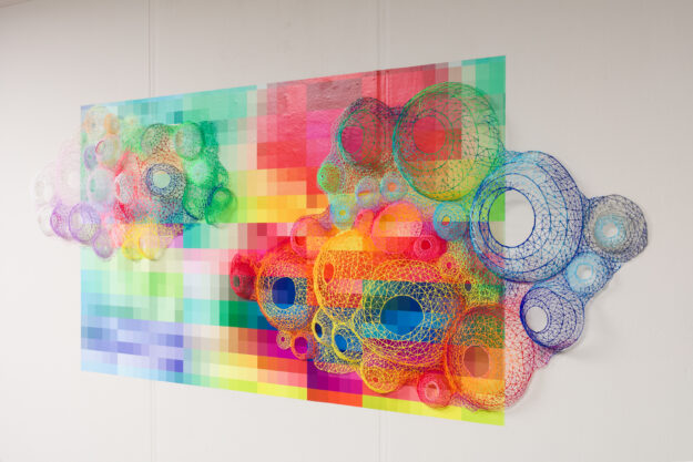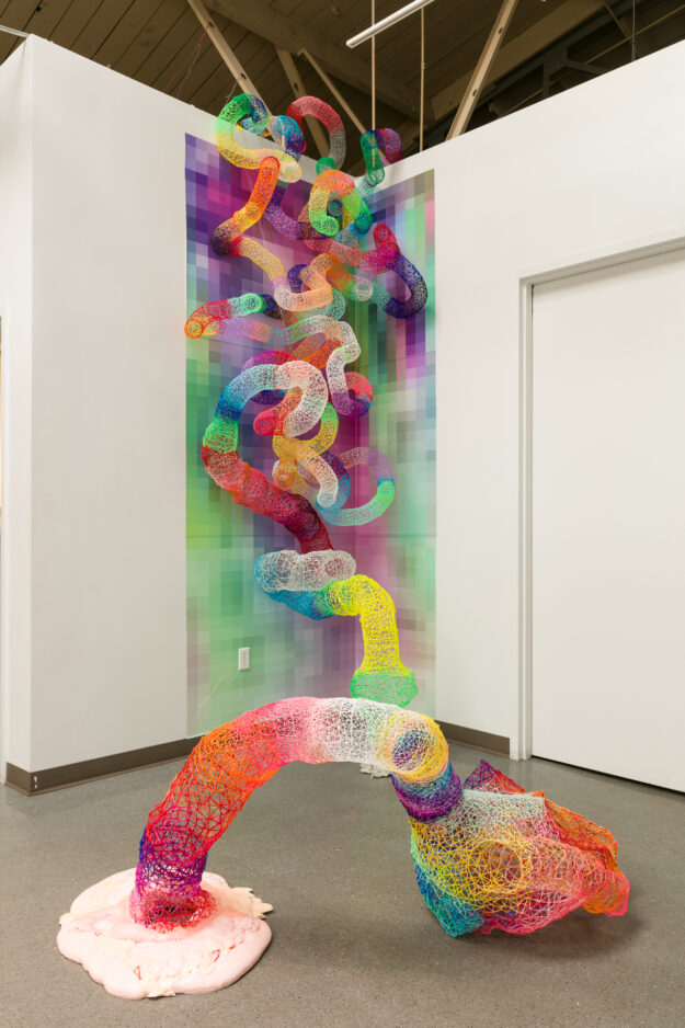 This isn’t just an art show; it’s the culmination of the local Precious Plastic Initiative. Much of the material used in these sculptures was processed right here in the Breckenridge studio using plastic donated by the community. Stuart utilizes the 3D-printing pen as a handheld drawing tool in a nostalgic gesture that is both meditative and tactile. Her process mirrors traditions like knitting or basket-weaving, resulting in “super-synthetic” forms that fill the void with a lightness and airiness that feels like stepping into a colorful 3d drawing in space.