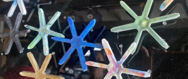 Plastic piles up around here in the spring, particularly around sledding hills, in the form of broken sleds. This colorful material is the key ingredient to the creative process. BreckCreate’s classes involve melting down the sleds and other community donated plastic trash (Numbers 1, 2, 5 and 6) in the studio. Using slabs of rainbow-colored plastic, students then create everything from planters, mosaics, jewelry and furniture.