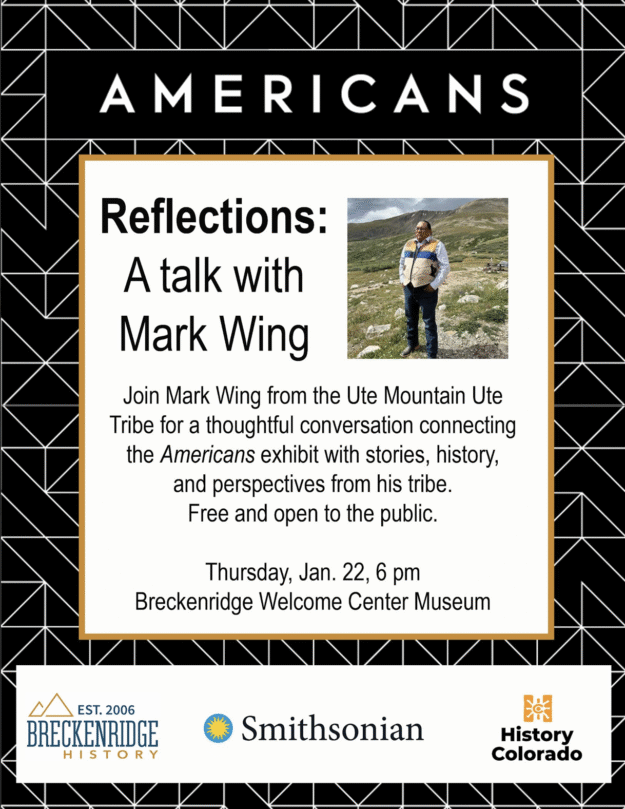 With support from History Colorado, Breckenridge History will host Ute Mountain Ute Tribal Member Mark Wing for a special program, Americans Reflections
