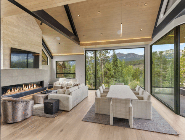 This brand-new modern masterpiece designed by Suzanne Allen-Sabo & constructed by Rockridge Building Company is ready for your next chapter of mountain ownership. Wind your way down the private lane to your secluded enclave on over 2 acres. The thoughtfully scaled interior coupled with expansive floor to ceiling windows, captures some of the best views on the market which encompass Buffalo Mountain all the way to Peak 10 of the Breckenridge Ski Resort. This residence is all about gathering friends & family together while affording the utmost in main floor living convenience. The great room has modern wood ceilings supported by steel beams and anchored by a massive fireplace to gather around on snowy nights.