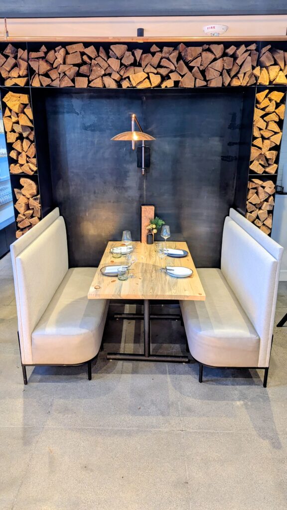 Just as his family would gather around the farm table in Yuma, passing plates and sharing stories, Nelson’s guests are warmed by Two Twelve’s  intentional ambiance. The 80-seat two-story restaurant showcases an open-concept kitchen, a hearth stacked with oak and hickory logs, the cozy soft amber glow of real candles, a centerpiece steel and glass wine cellar, flatware from Paris, beetlekill pine tables, and tweed and sherpa fur seating.